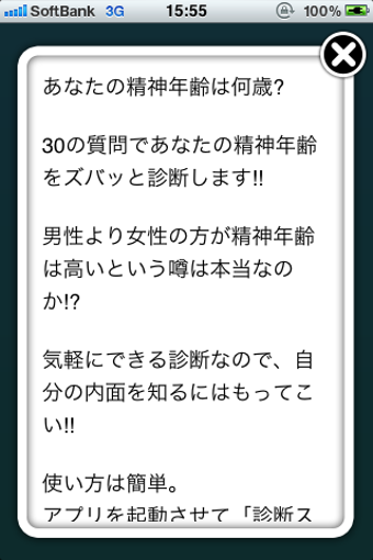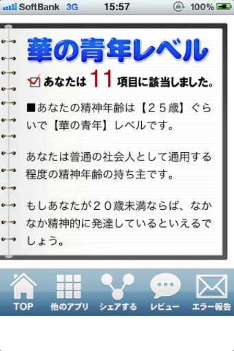 精神年齢診断+は、30問の簡単な設問に答えるだけで、自分の精神年齢を診断してくれる無料アプリです。ちなみにレビューを書いている私は実年齢相応でした。
