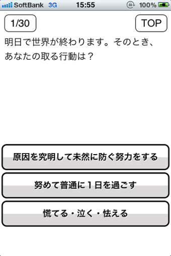 精神年齢診断+を開いたら、「診断スタート」をタップして早速自分や友だち、家族の精神年齢をチェックしましょう。「休日はなにをしたいですか?」「今、あなたの欲しいものは?」など全30問ある設問に対して、3択の中から自分に一番当てはまるものを選んでください。操作はタップするだけなので、片手がふさがっていても診断を受けられます。